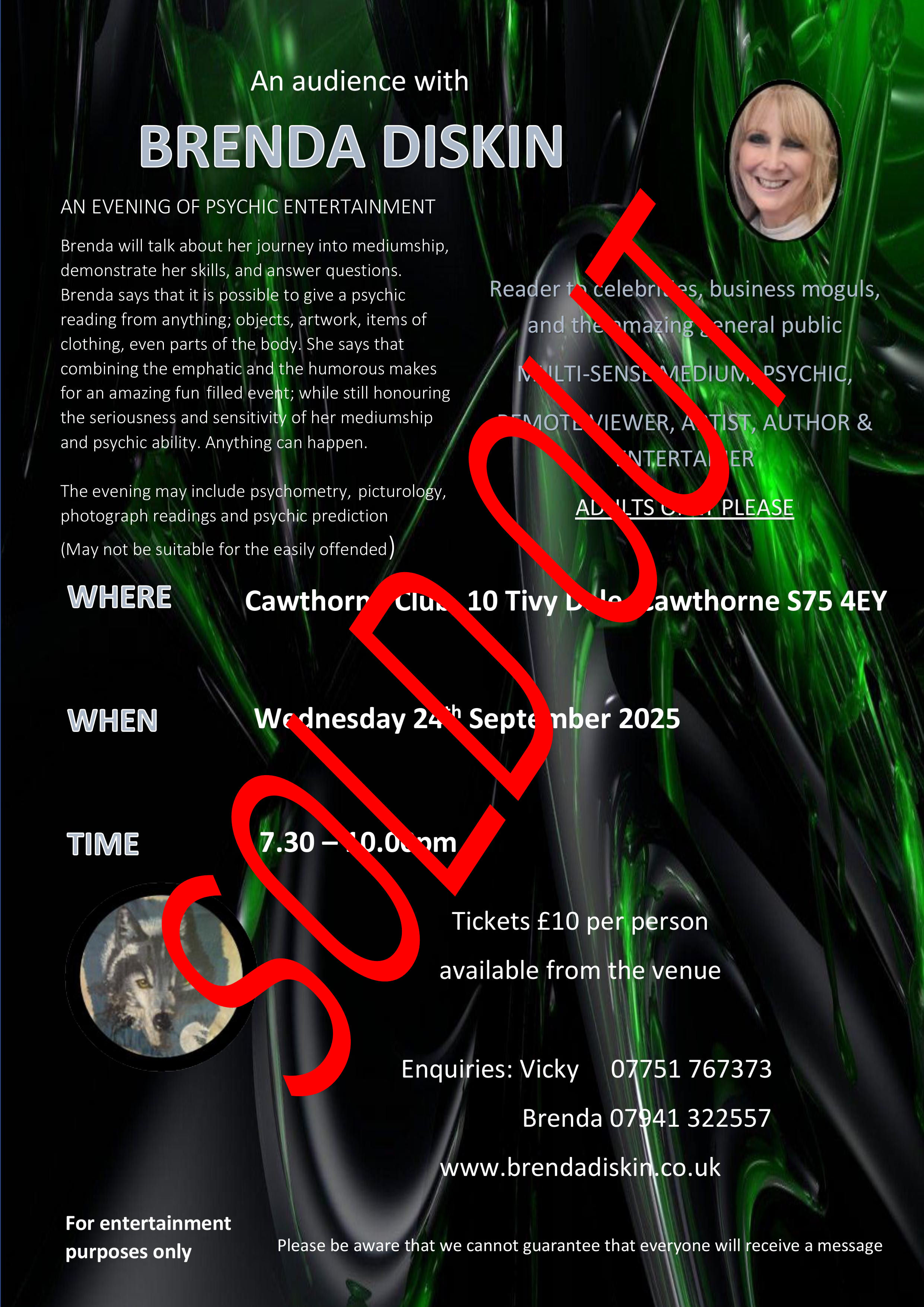 An evening of psychic entertainment with Bren Diskin at Cawthorne Club. Brenda will talk about her journey into mediumship, demonstrate her skills, and answer questions.Not everyone is guaranteed a message. Adults only (may not be suitable for the easily offended) |