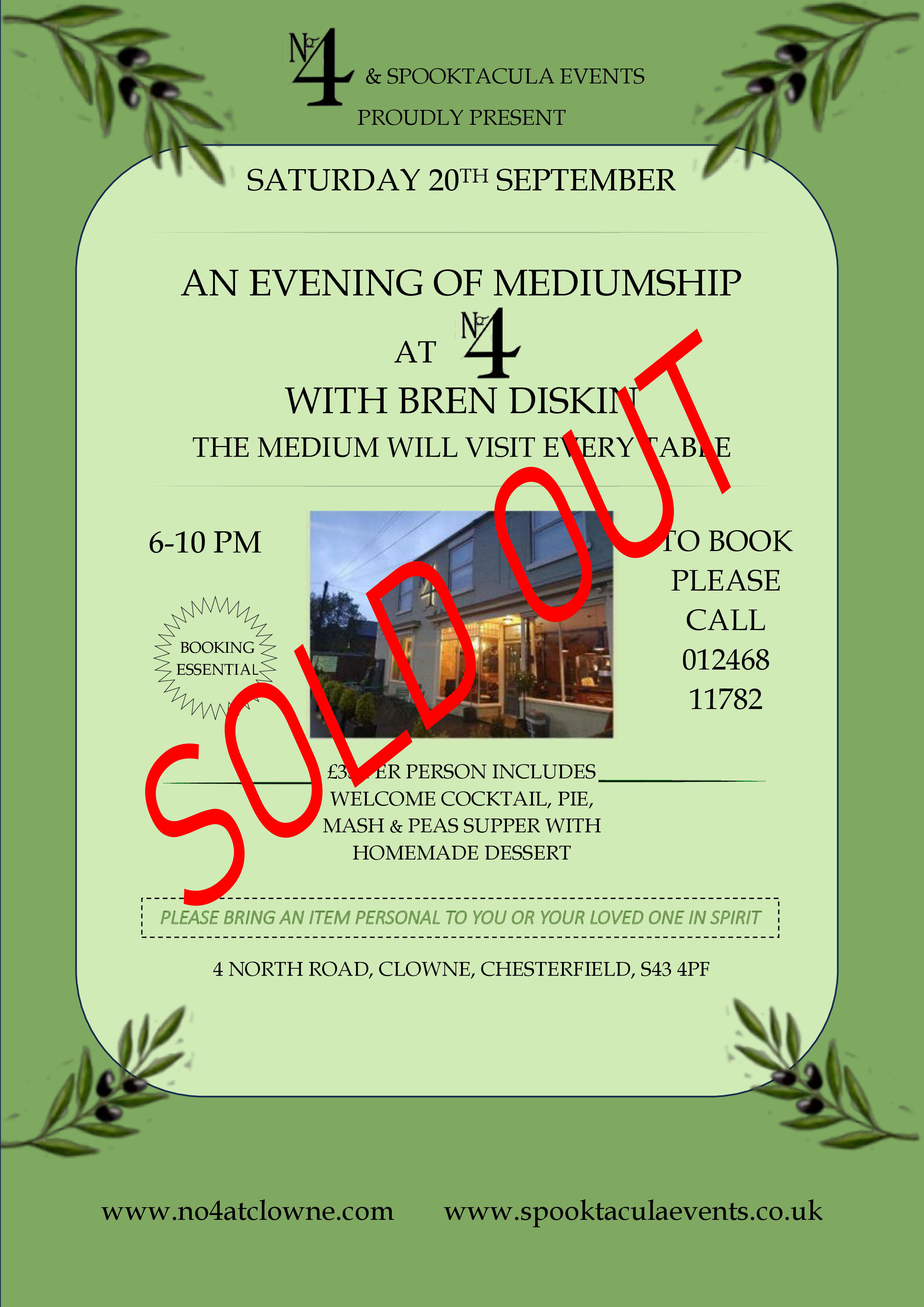 Join Bren Diskin for an evening of psychic and mediumistic readings while enjoying a delicious meal and cocktail with friends at No4 in Clowne. Brenda will visit every table but cannot guarantee that she can read for everyone but you will all take home a little gift of tarot card reading in an envelope |