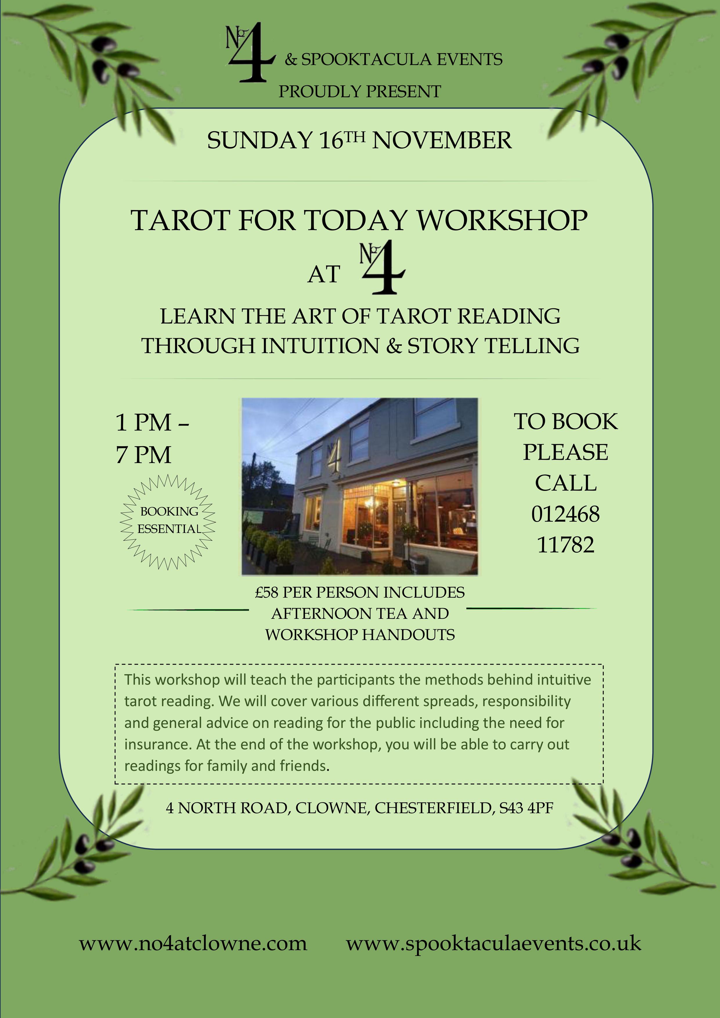 Tarot for Today. Learn the art of Tarot reading through intuition and story telling. This workshop will teach the participants the methods behind intuitive tarot reading. The workshop uses the Major Arcana but the the other cards can easily be integrated after. We will cover various different spreads, responsibility and general advice on reading for the public including the need for insurance. At the end of the workshop you will be able to carry out readings for family and friends and, with practise, you will gain the confidence and the ability to read for others in a professional manner. Price includes No4's delicious afternoon tea and workshop handouts. |