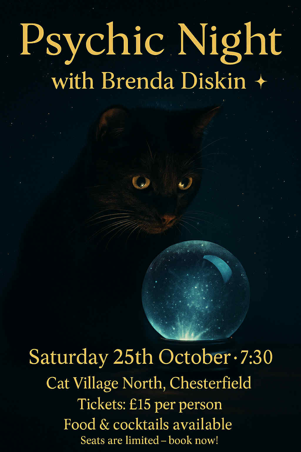 Saturday 25th October £15.00 per person limited seats. Food and cocktails available. Proceeds towards veterinary care for the cats.