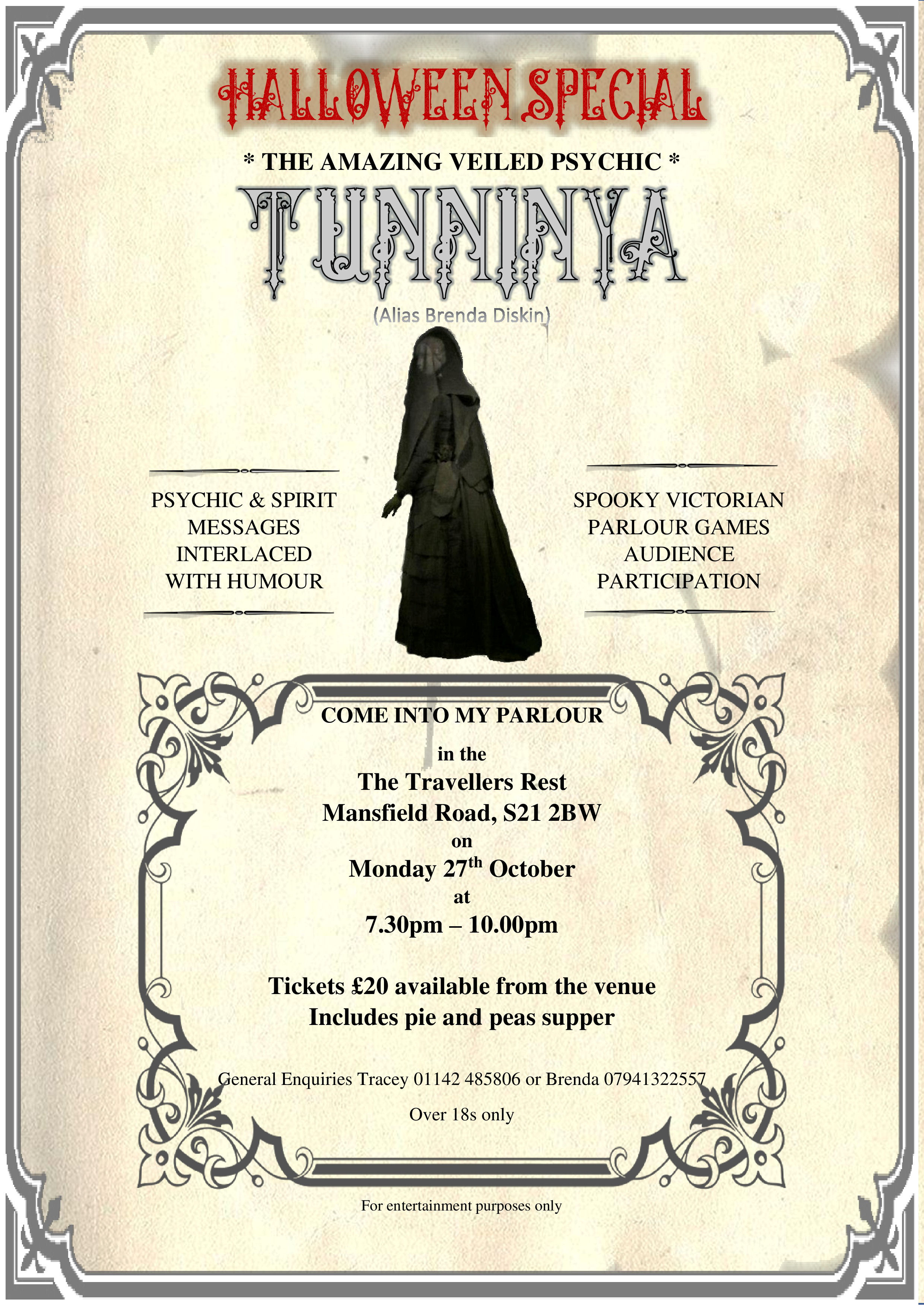 | Join The Veiled Psychic at the Travellers, Rest High Moor, Killamarsh for an evening of psychic and spirit messages laced with humour, spooky Victorian Parlour Games, and more. Price includes a pie and peas supper. |
